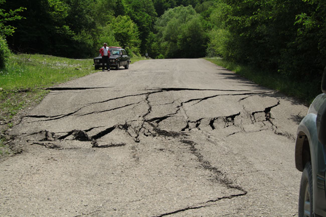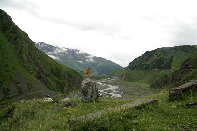 Memorials and headstones lie strewn around the Georgian - Chechen border