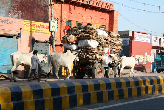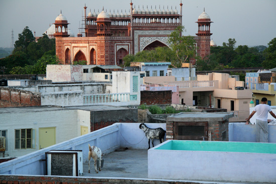 Rooftops over Taj Ganj; the Taj Mahal's gatehouse in the background. Note the goats...