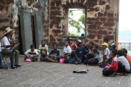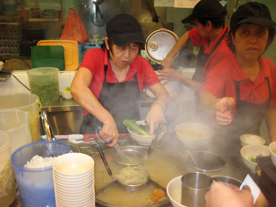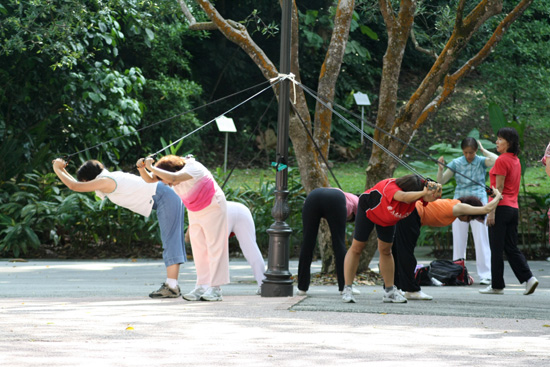 A Chinese exercise class in Singapore's botanical gardens - poor lamppost...