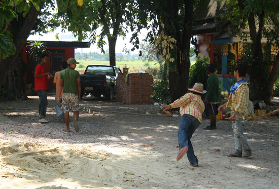 Labourers playing a version of skittles in the monastery