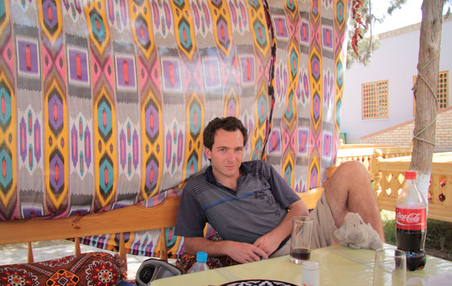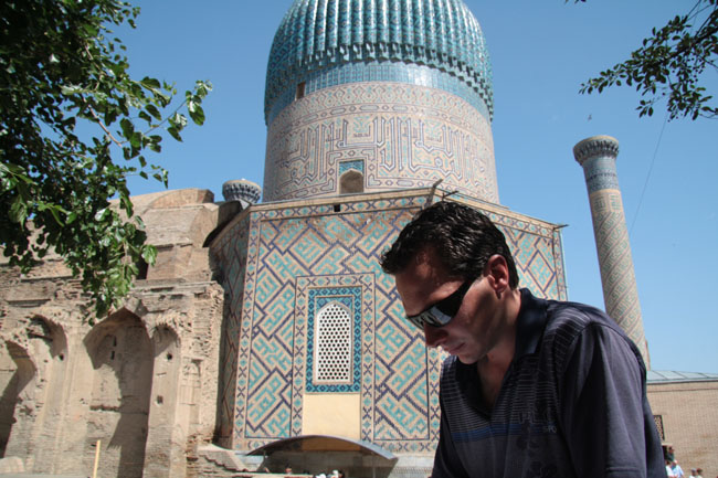 Reading up in the shade of Gur-I-Amir, Samarkand