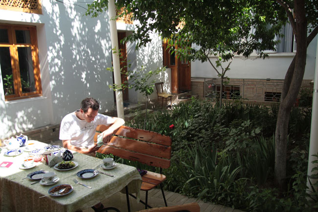 In the courtyard of our guesthouse, swatting up over breakfast